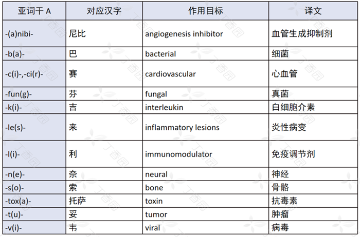 亚词干 A:表明单克隆抗体的作用目标(分子、细胞和器官)的类别,如「-t(u)-」代表肿瘤,中文对应「妥」。