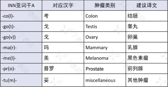 还有一类较少使用的亚词干 A 反应其治疗肿瘤的类别,如「-co(l)- 」代表结肠,中文对应「考」。