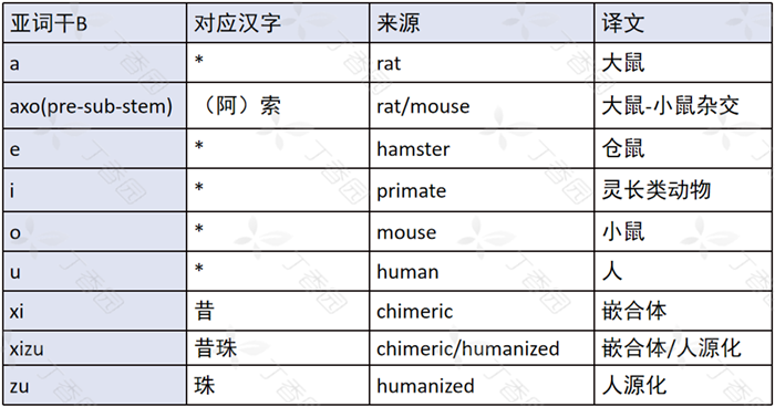 亚词干 B:用来表明单克隆抗体的免疫球蛋白序列的物质来源,如「xi 」表示嵌合体,中文对应「昔」。