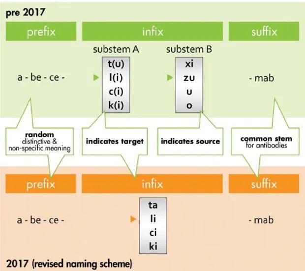 因此,在 2017 年 4 月召开的「64th Consultation on International Nonproprietary Names for Pharmaceutical Substances」会议上有一次命名规则的修订,修订后单抗来源的词缀被删除。新的命名规则由 [前缀 + 亚词干 + 词尾 ] :