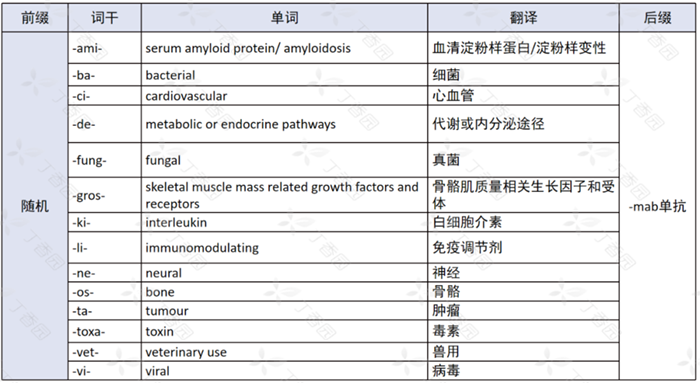 WHO 的单克隆抗体 INN 命名规则由 [前缀 + 亚词干 A + 亚词干 B + 词尾] 组成,除了前缀,其他三部分都有确定的含义。