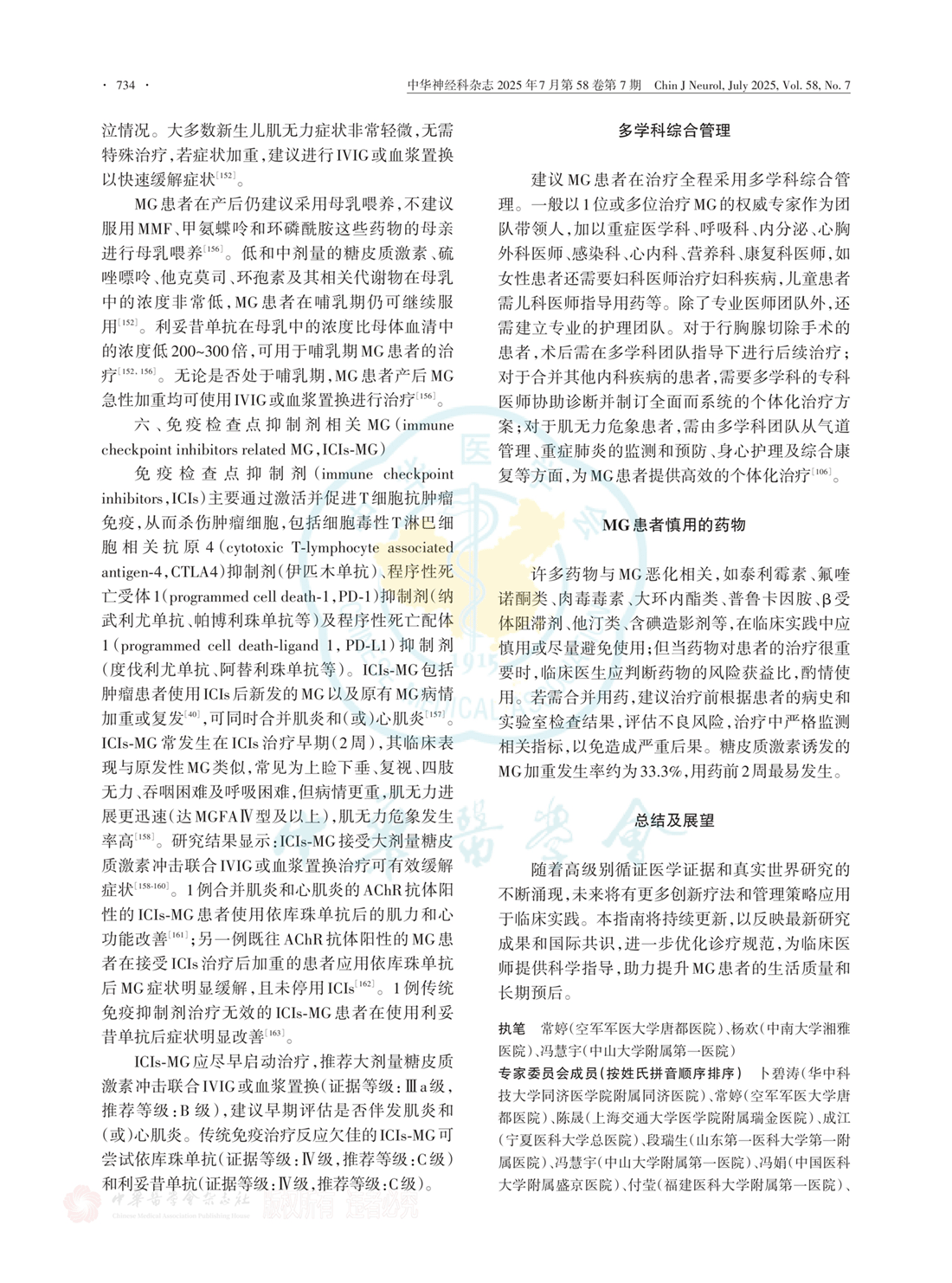 多学科综合管理、MG患者慎用的药物、总结及展望