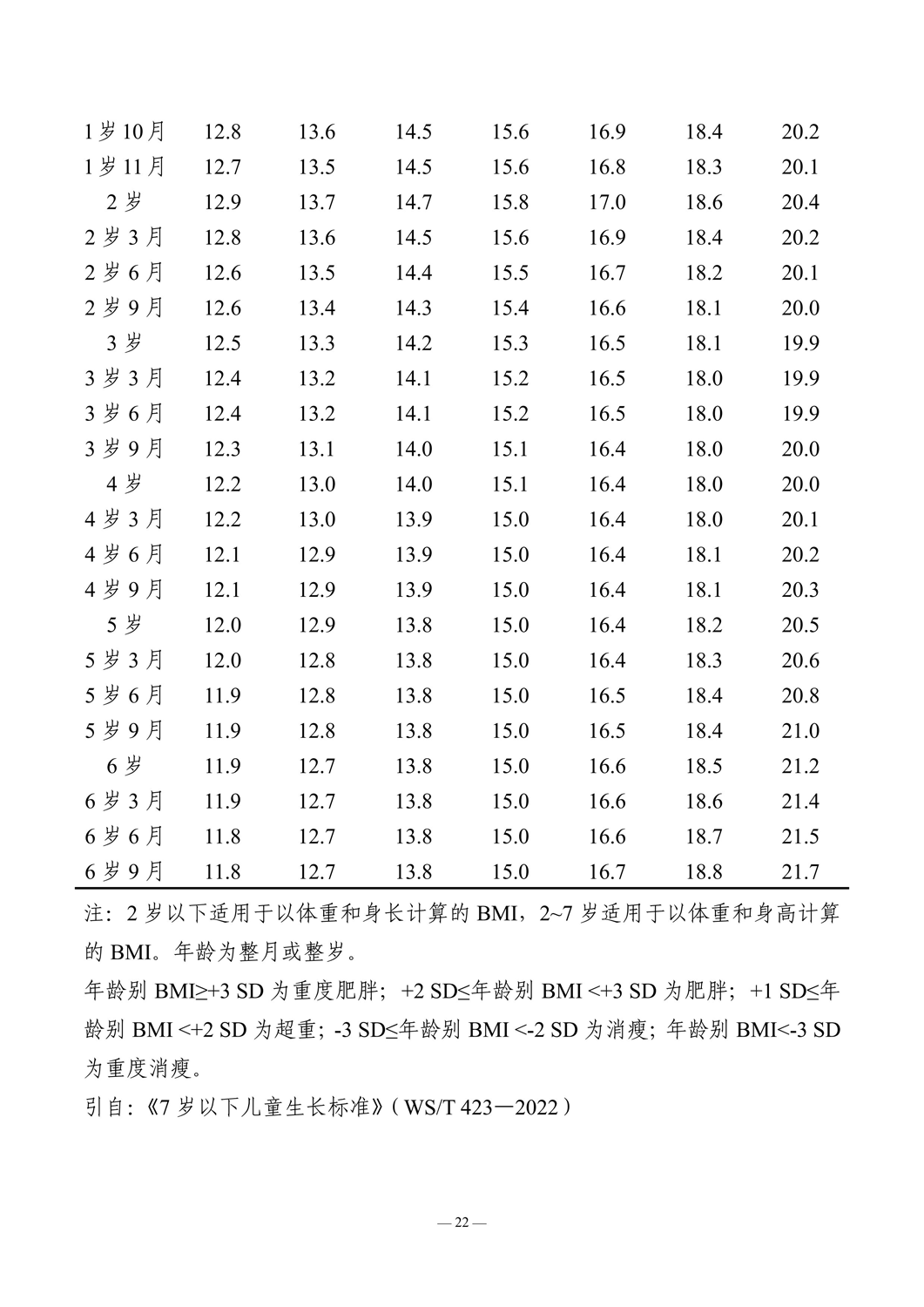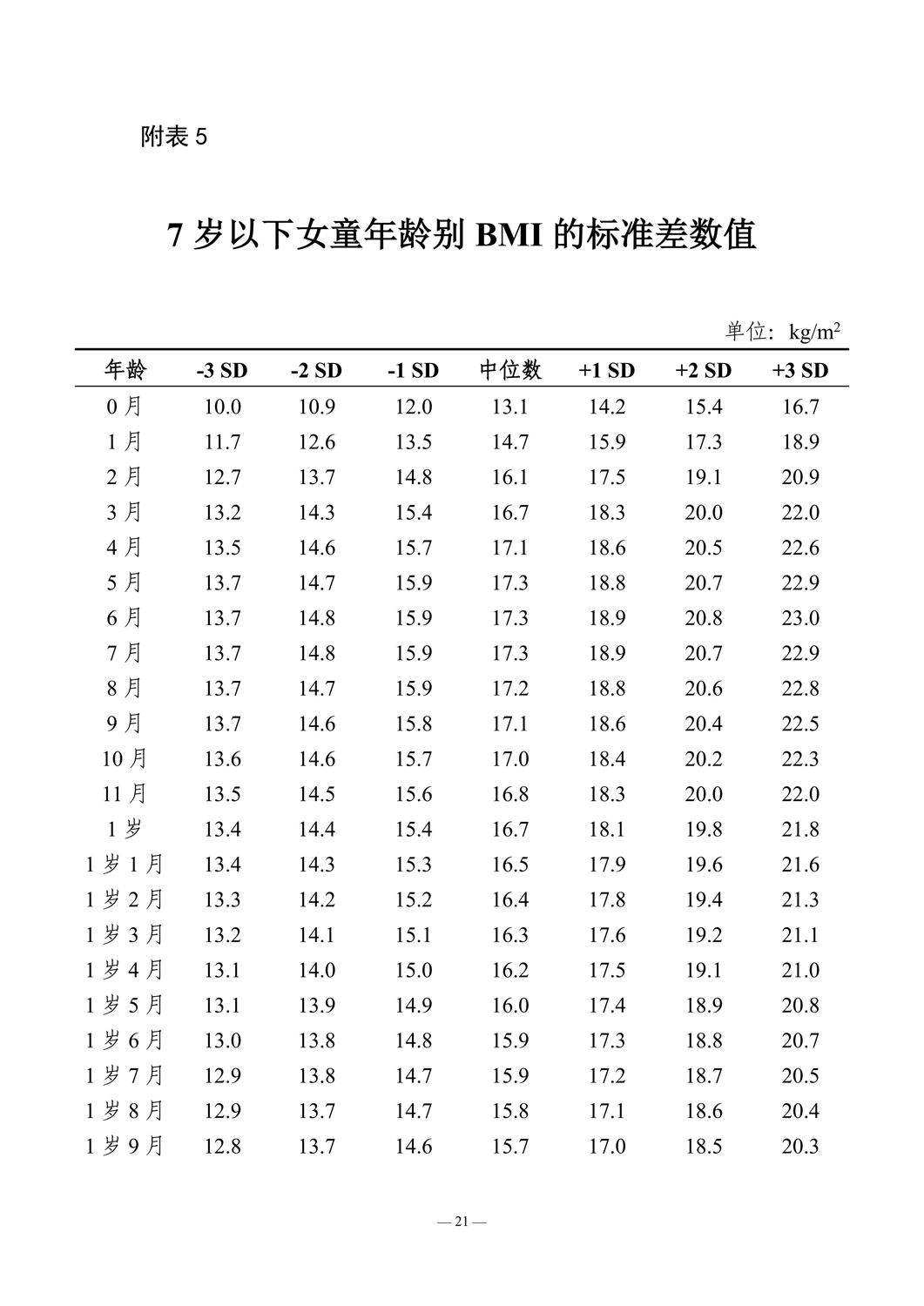 7岁以下女童年龄别BMI的标准差数值