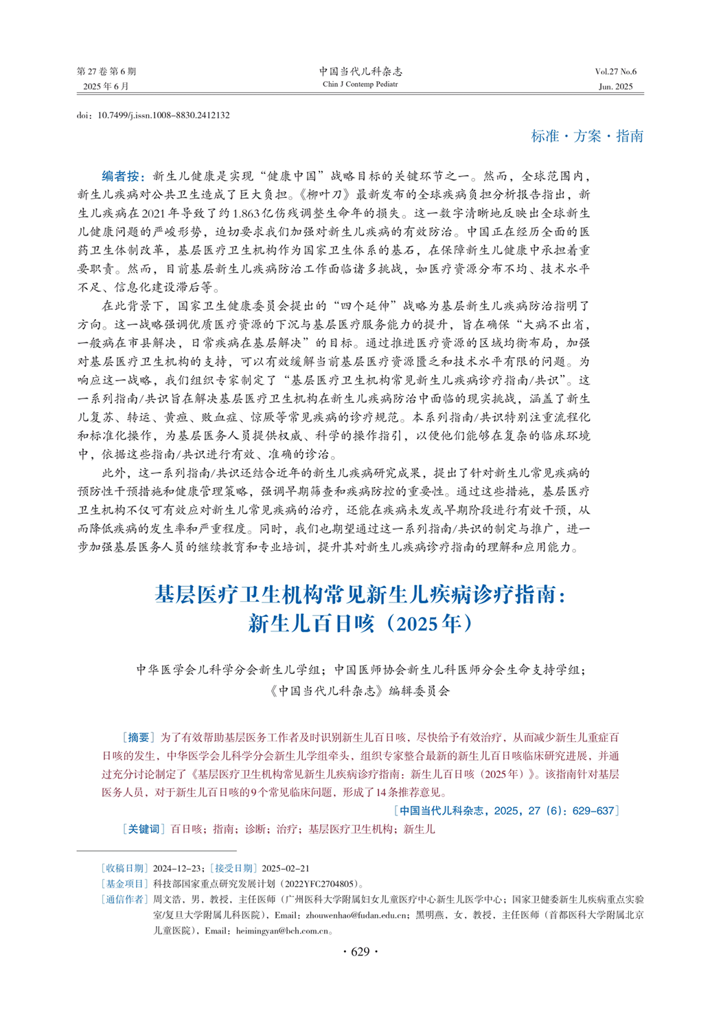 基层医疗卫生机构常见新生儿疾病诊疗指南:新生儿百日咳(2025年)