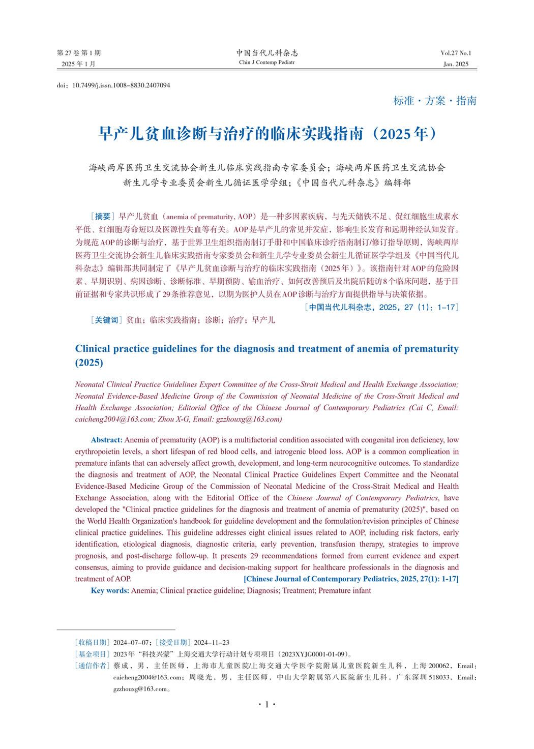 早产儿贫血诊断与治疗的临床实践指南(2025年)