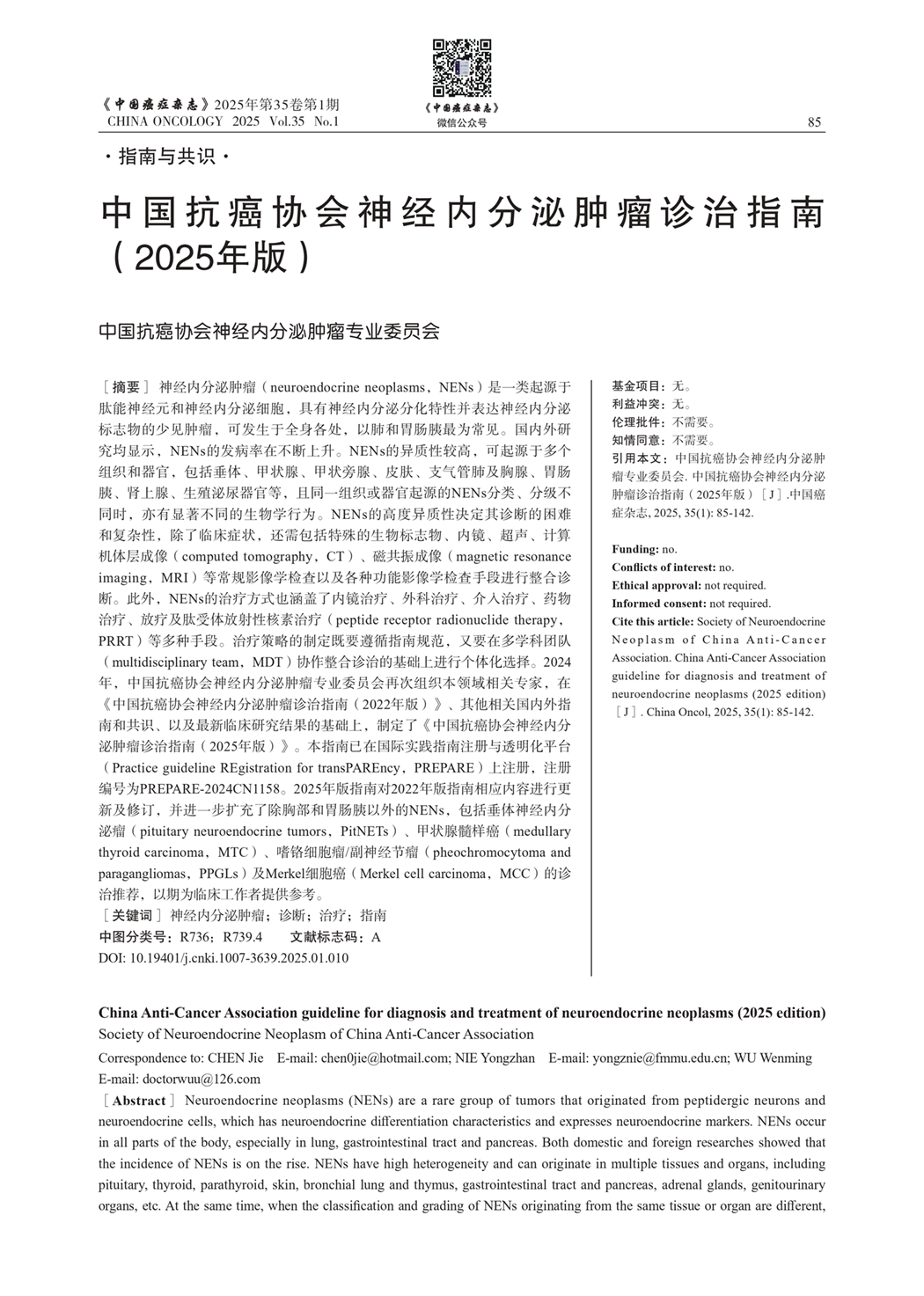 中国抗癌协会神经内分泌肿瘤诊治指南(2025年版)