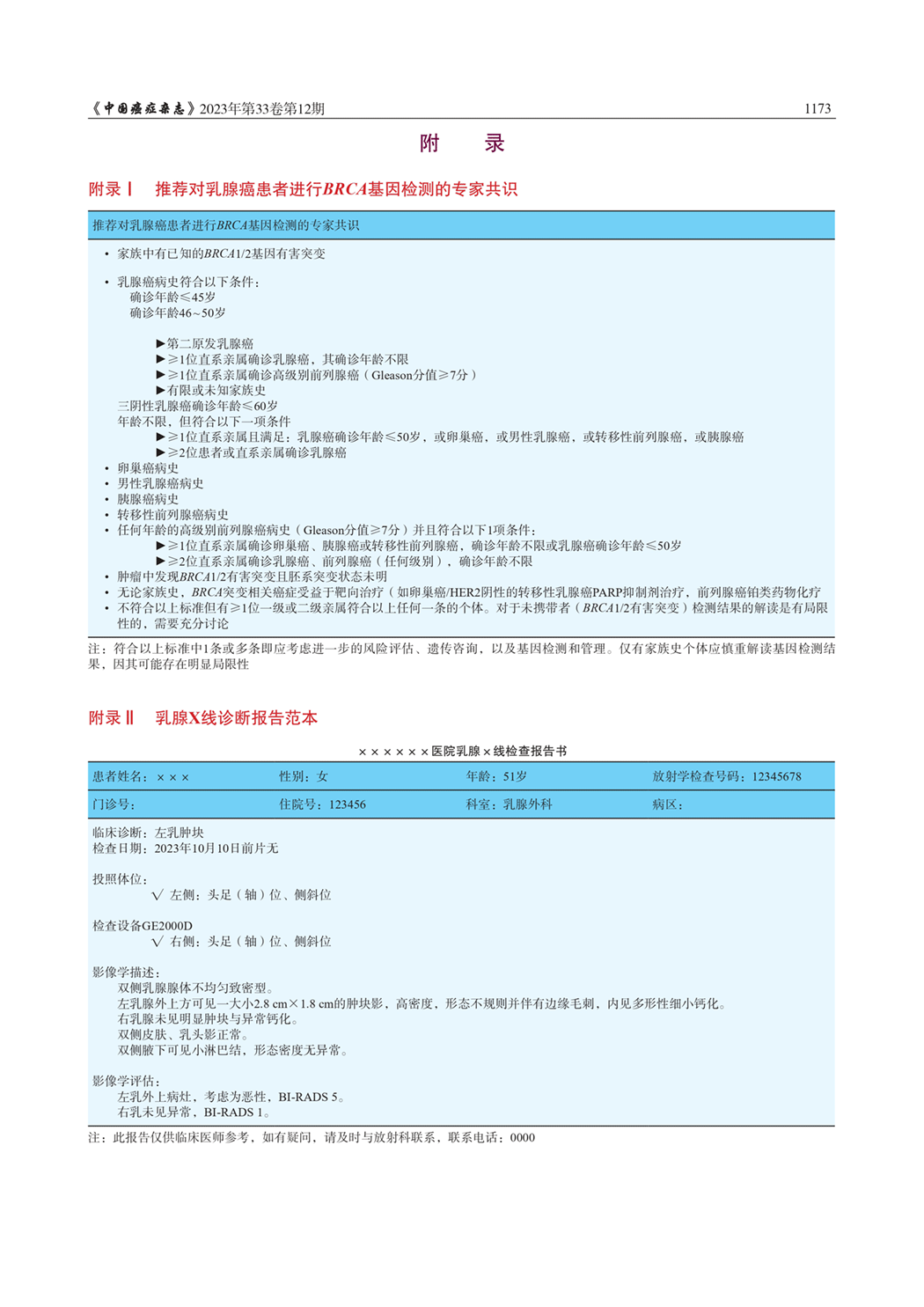 附录Ⅰ BRCA基因检测共识 附录Ⅱ 乳腺X线诊断报告范本