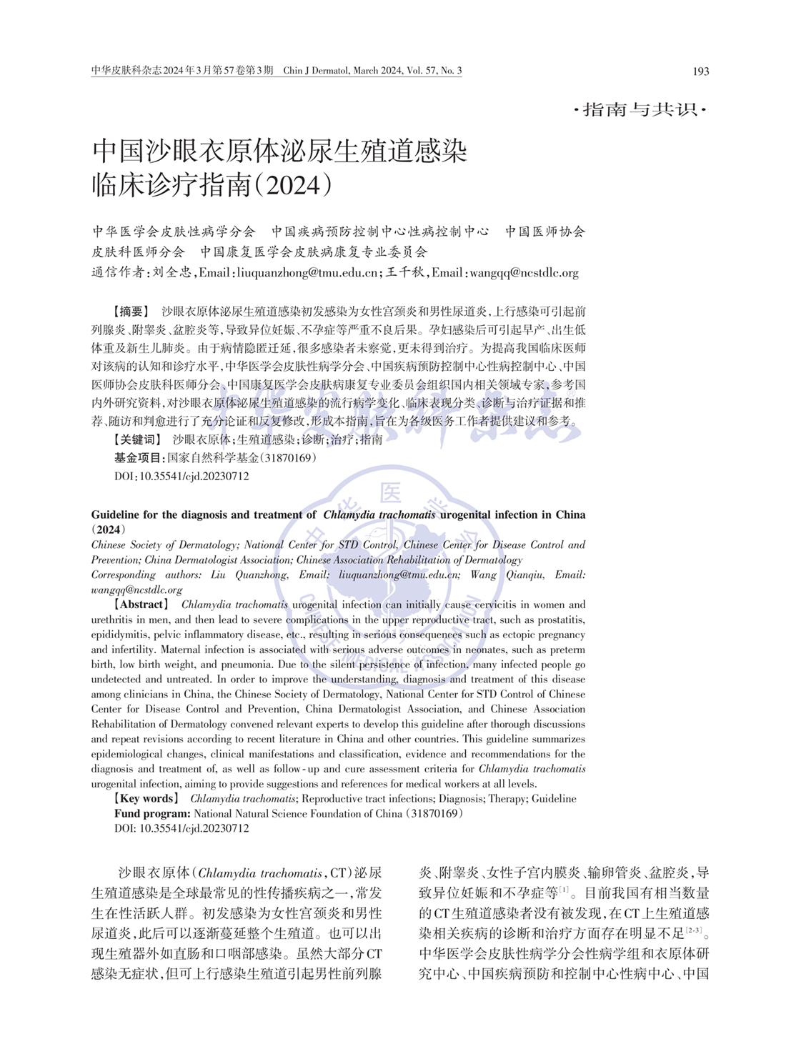 中国沙眼衣原体泌尿生殖道感染临床诊疗指南(2024年)