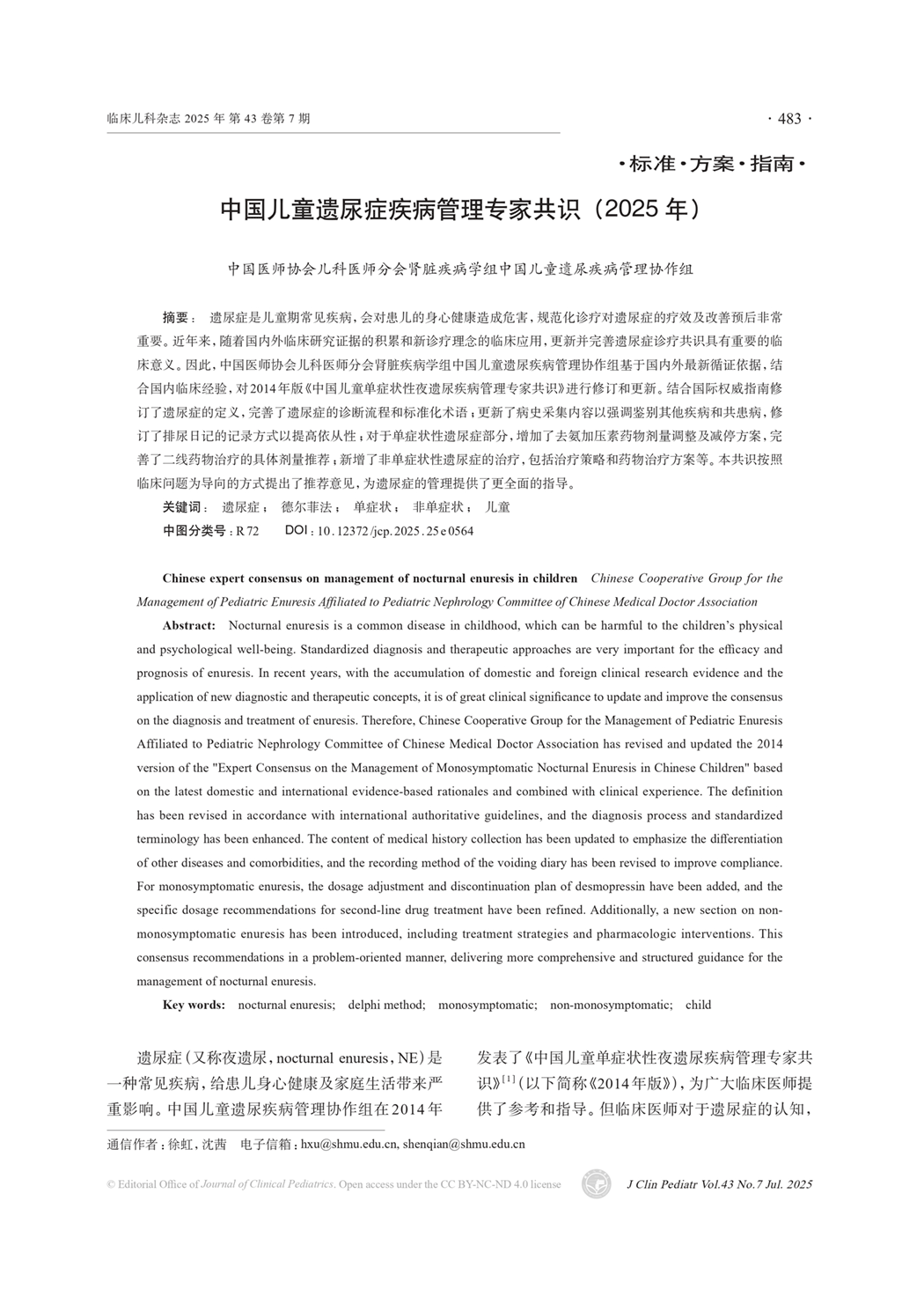 中国儿童遗尿症疾病管理专家共识(2025年)