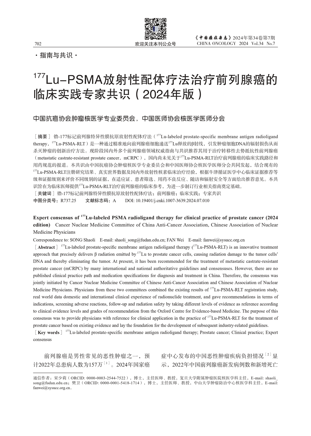 177Lu-PSMA放射性配体疗法治疗前列腺癌的临床实践专家指南(2024年版)