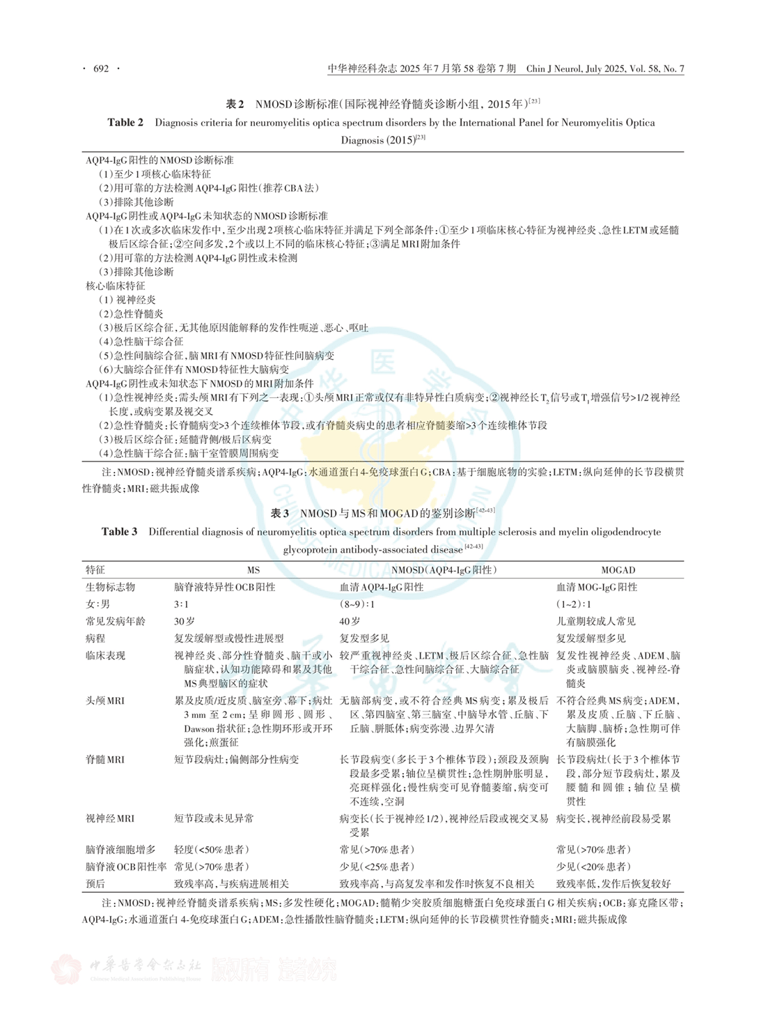 表2 NMOSD诊断标准 表2 NMOSD与MS和MOGAD的鉴别诊断