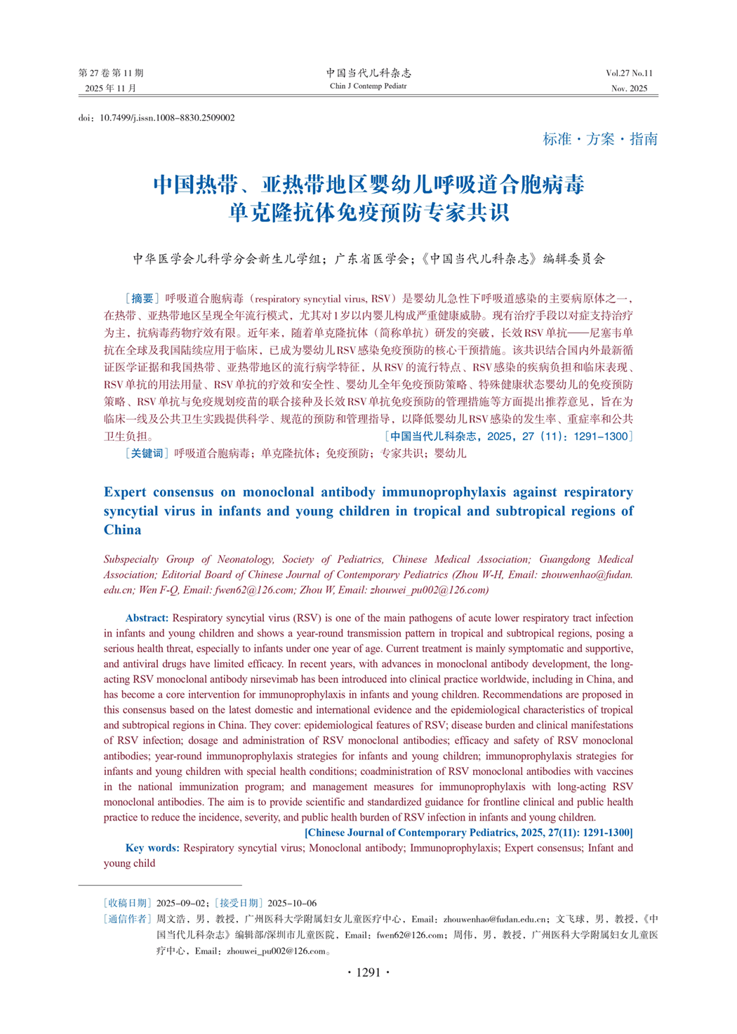中国热带、亚热带地区婴幼儿呼吸道合胞病毒单克隆抗体免疫预防专家共识(2025年)