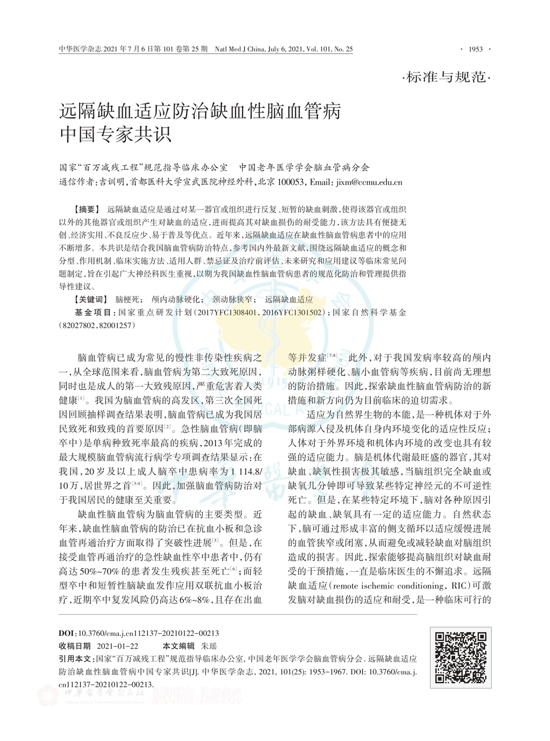 远隔缺血适应防治缺血性脑血管病中国专家共识(2021年)
