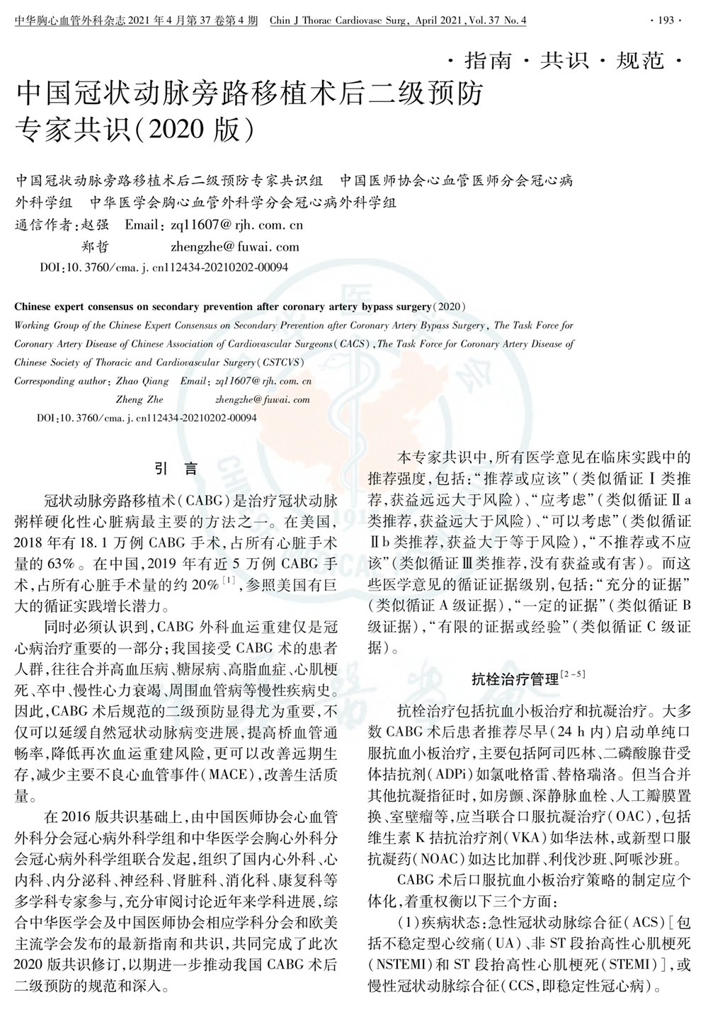 中国冠状动脉旁路移植术后二级预防专家共识(2020年)