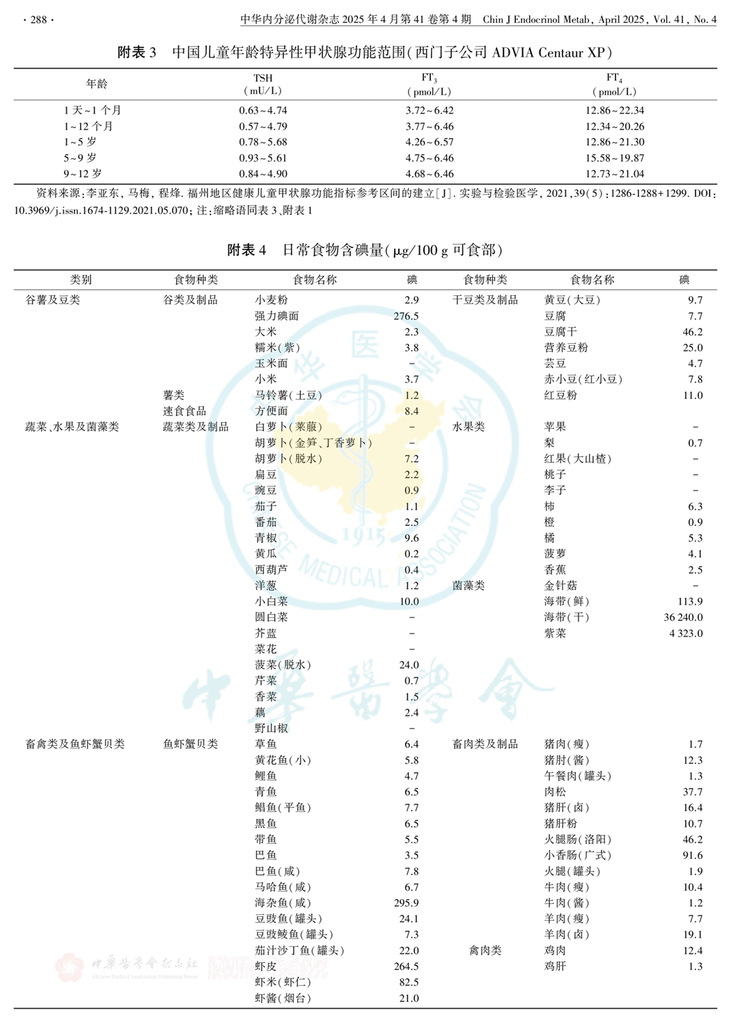 表1 儿童年龄特异性甲状腺功能范围 表4 日常食物含碘量