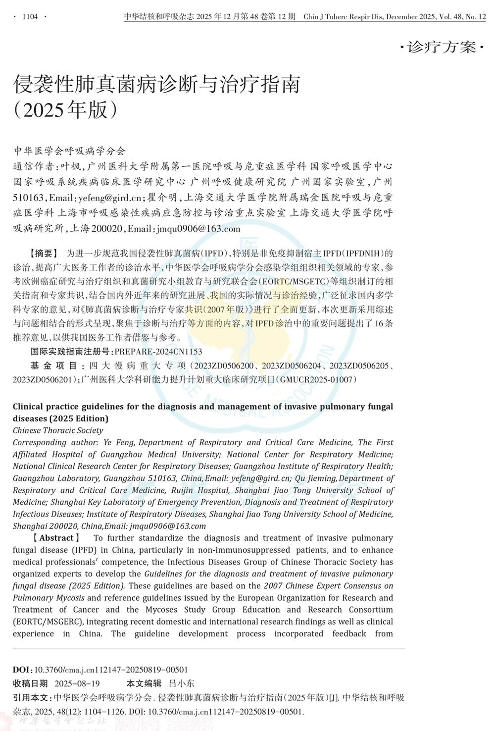 侵袭性肺真菌病诊断与治疗指南(2025年版)