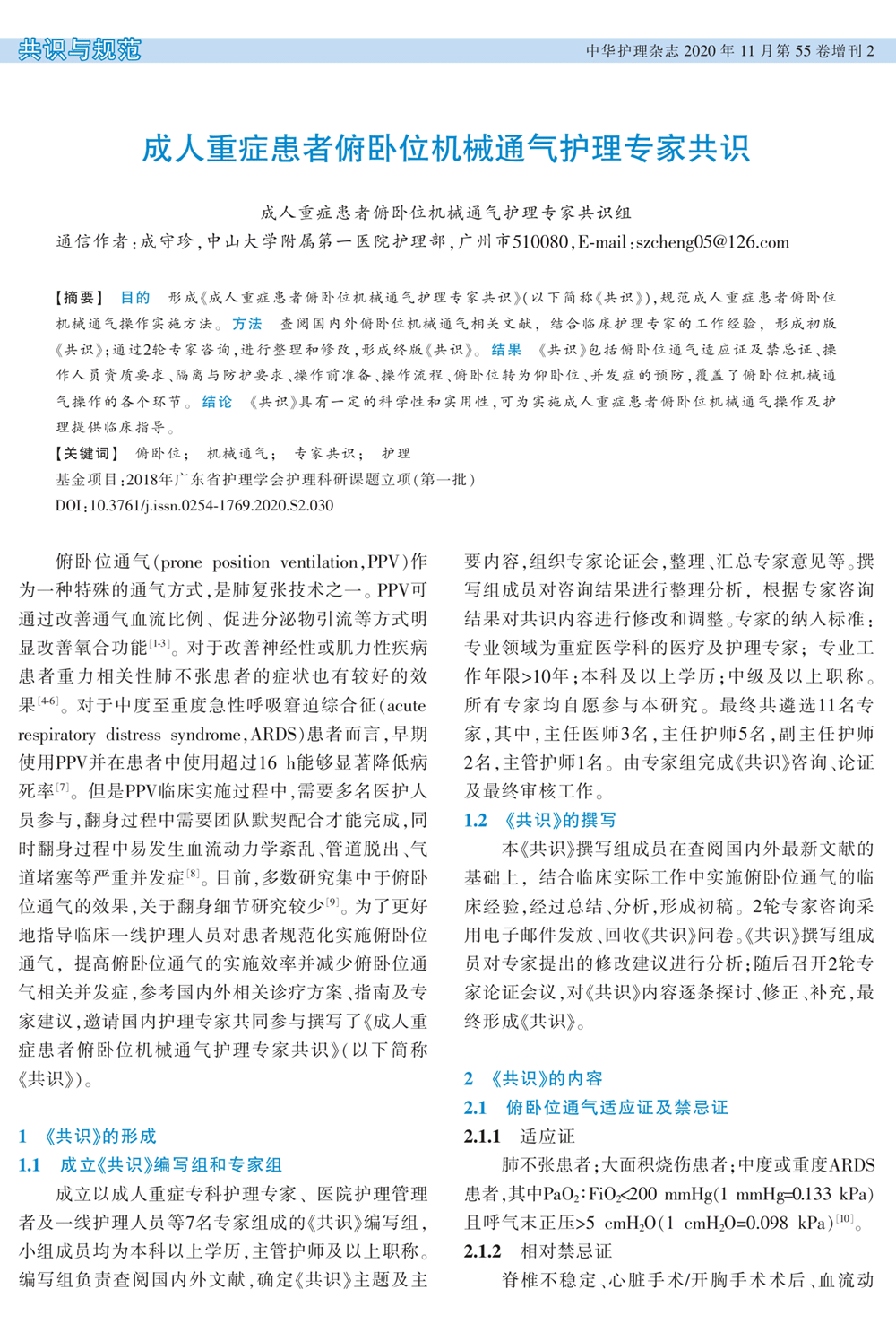 成人重症患者俯卧位机械通气护理专家共识(2020年)