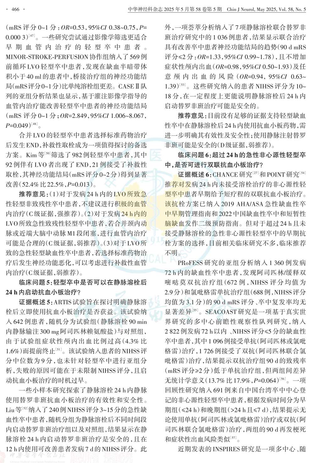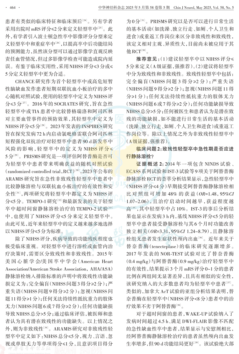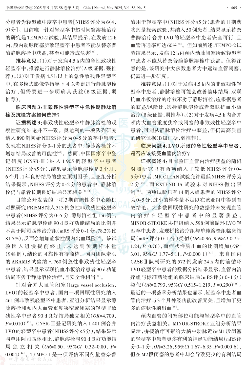 临床问题和推荐意见:定义轻型卒中、是否进行静脉溶栓、抗血小板治疗