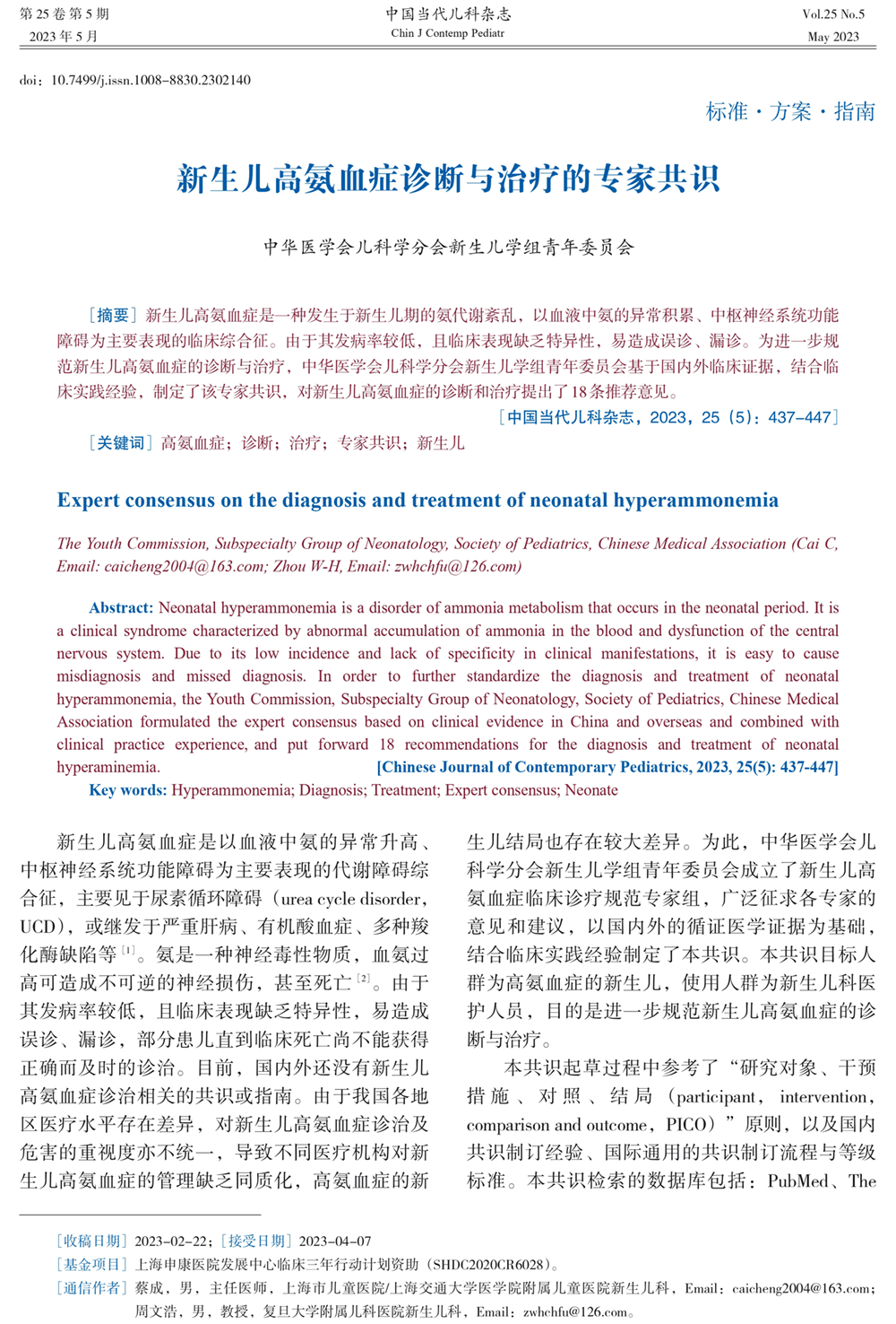 新生儿高氨血症诊断与治疗的专家共识(2023年)