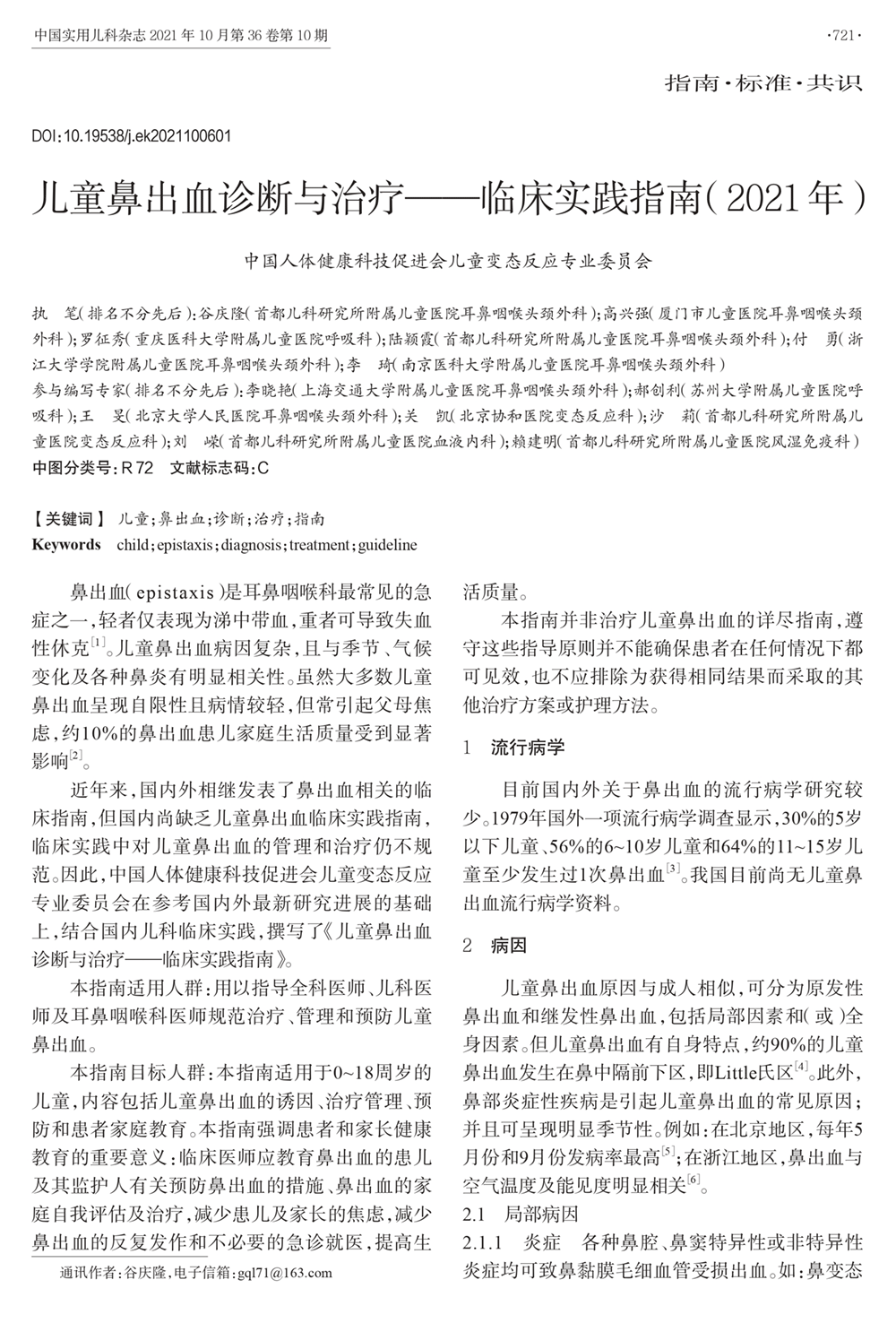 儿童鼻出血诊断与治疗临床实践指南(2021年)