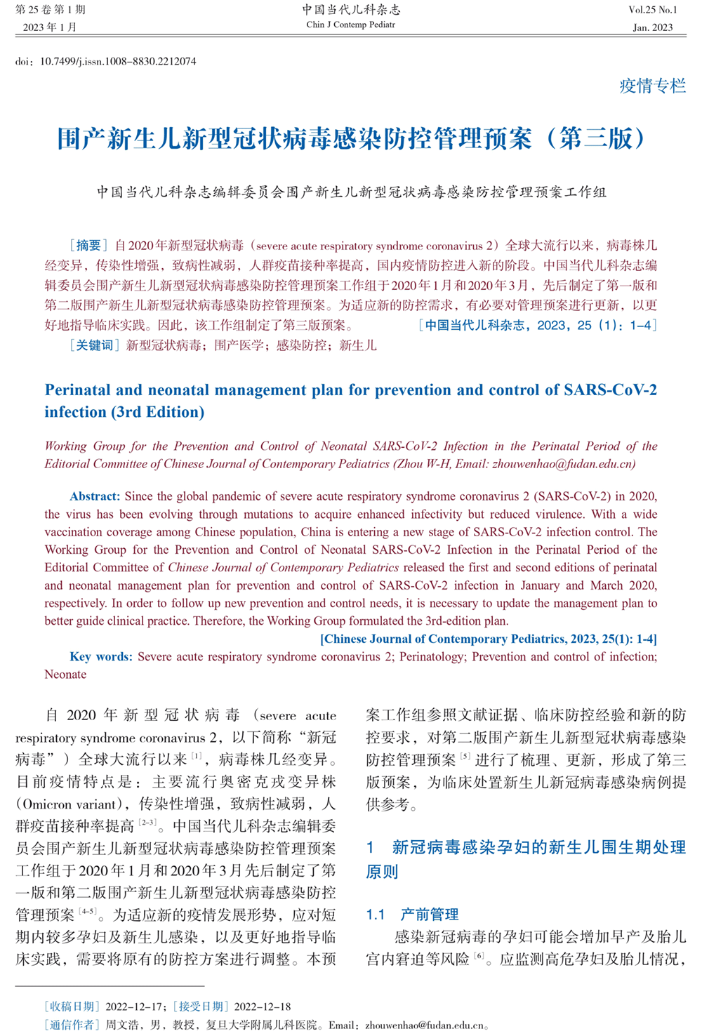 围产新生儿新型冠状病毒感染防控管理预案(第三版2023年)