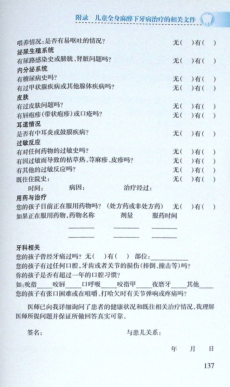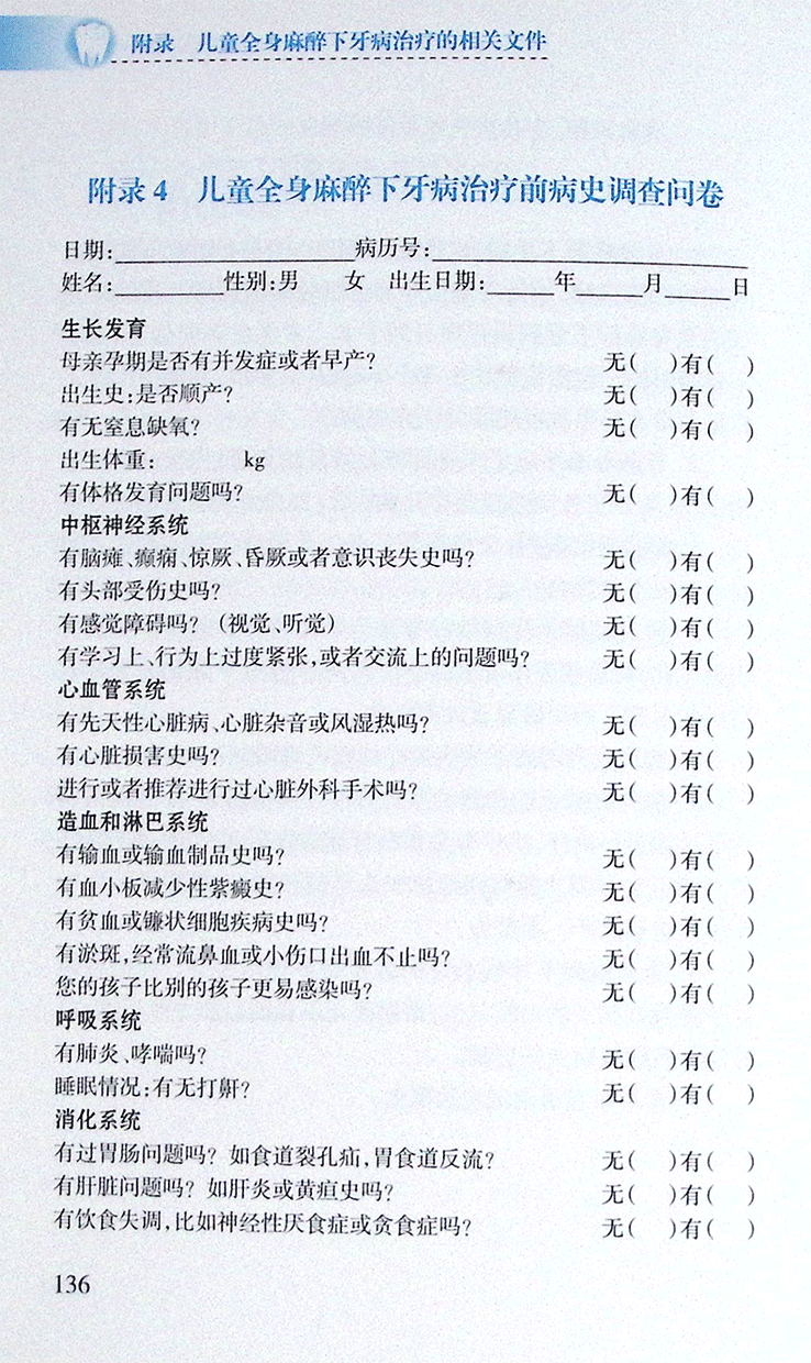 附录4 儿童全身麻醉下牙病治疗前病史调查问卷