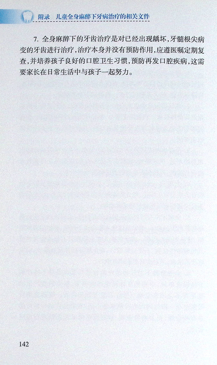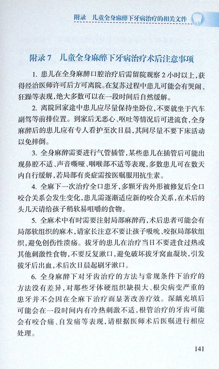 附录7 儿童全身麻醉下牙病治疗术后注意事项