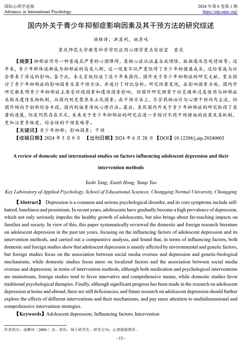 国内外关于青少年抑郁症影响因素及其干预方法的研究综述(2024年)