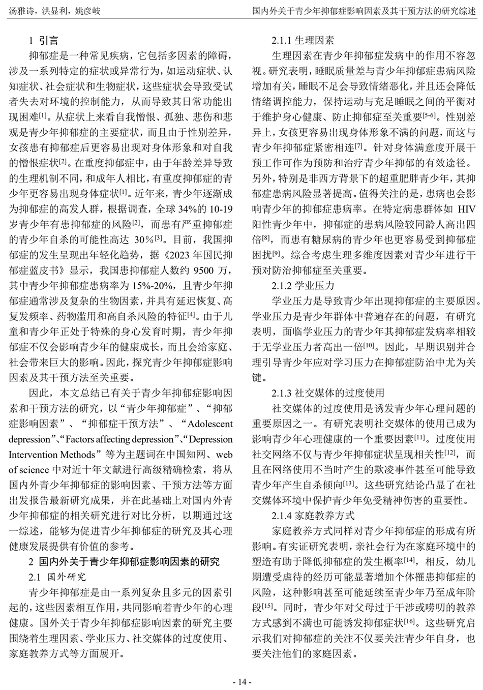 国内外关于青少年抑郁症影响因素及其干预方法的研究综述(2024年)