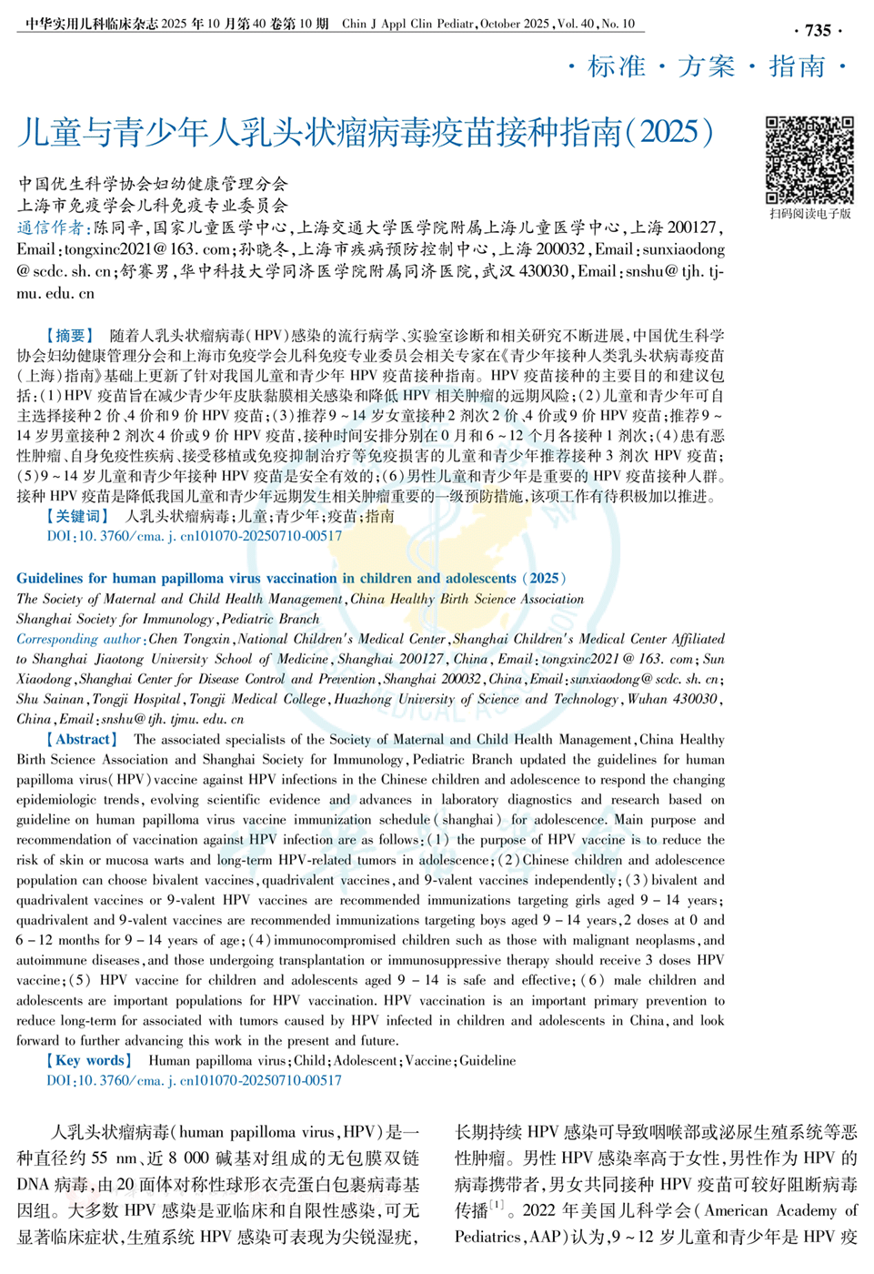 儿童与青少年人乳头状瘤病毒疫苗接种指南(2025年)