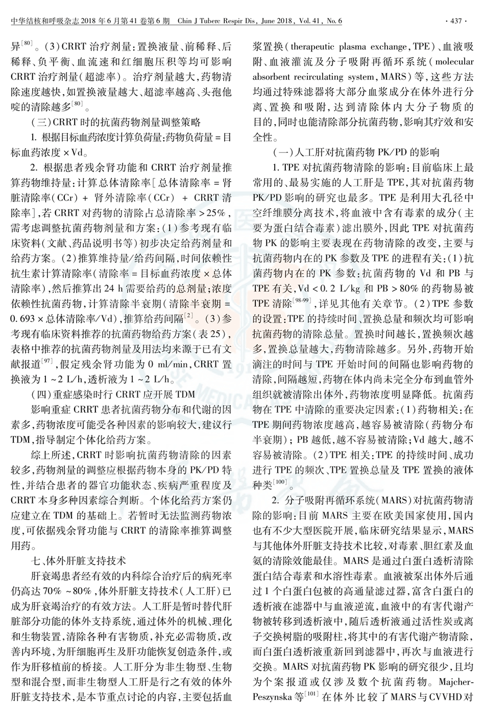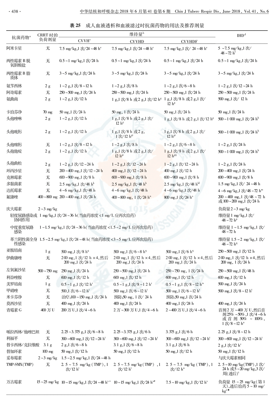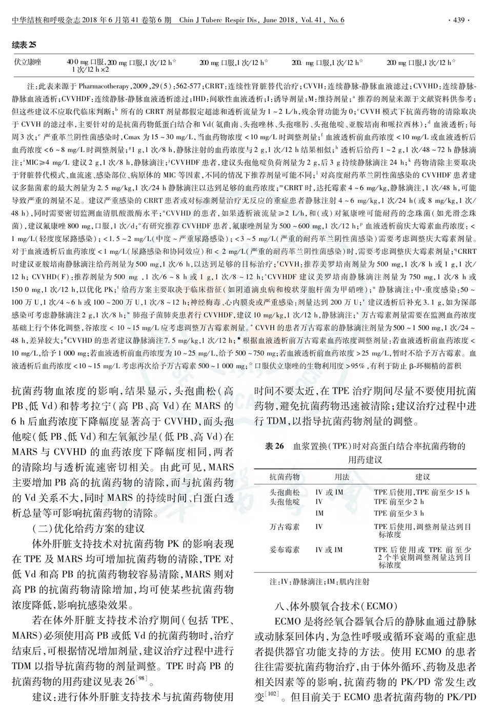 七、体外肝脏支持技术 表25 成人血液透析和血液滤过时抗菌药物的用法及推荐剂量