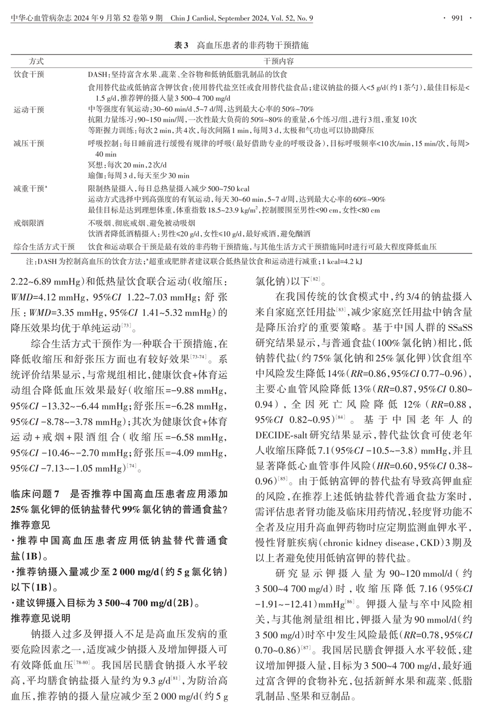 临床问题7:是否推荐添加低钠盐替代普通食盐? 表3:高血压患者非药物干预措施