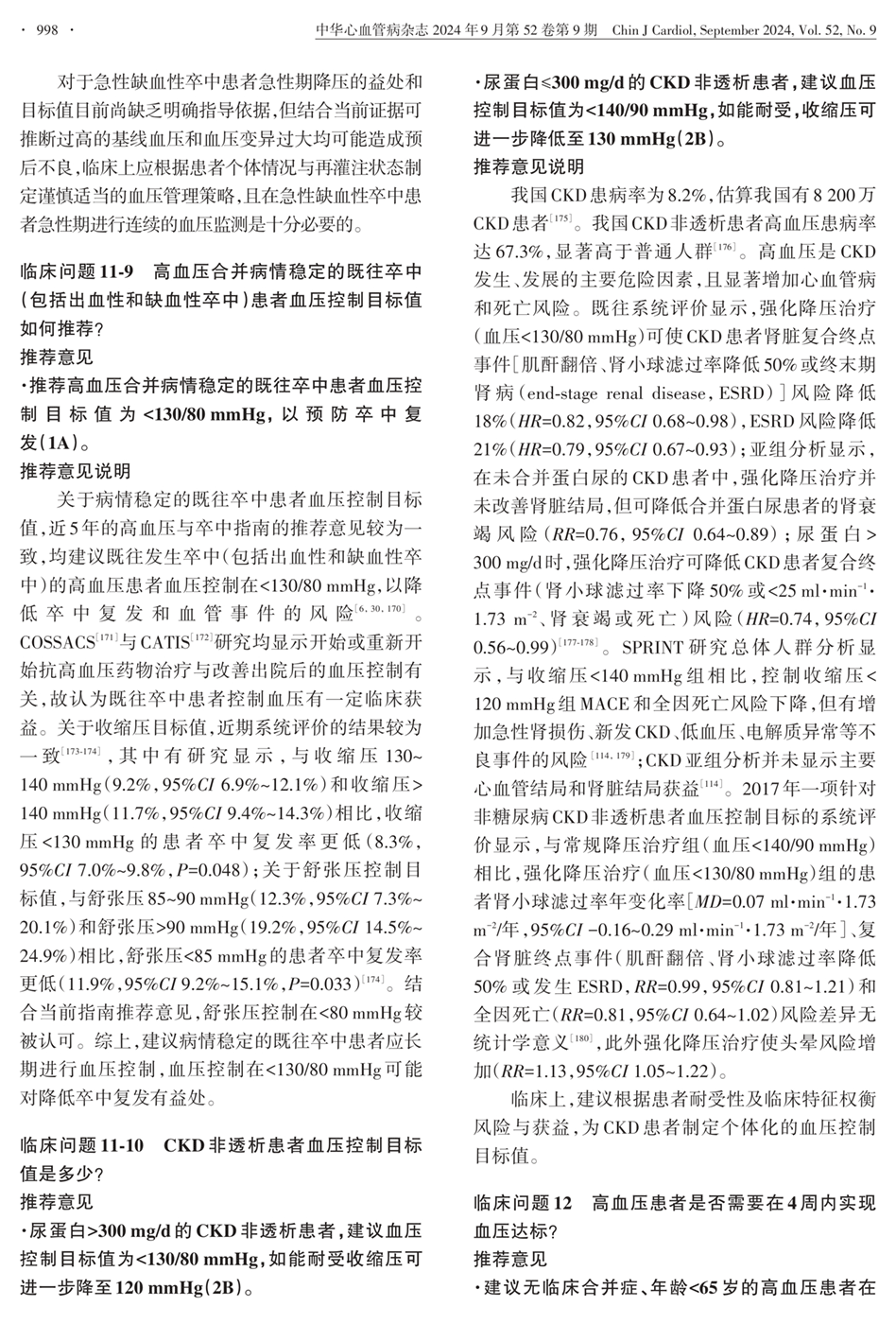 临床问题11-9:合并病情稳定卒中血压控制目标值?临床问题11-10:CKD非透析患者控制目标?