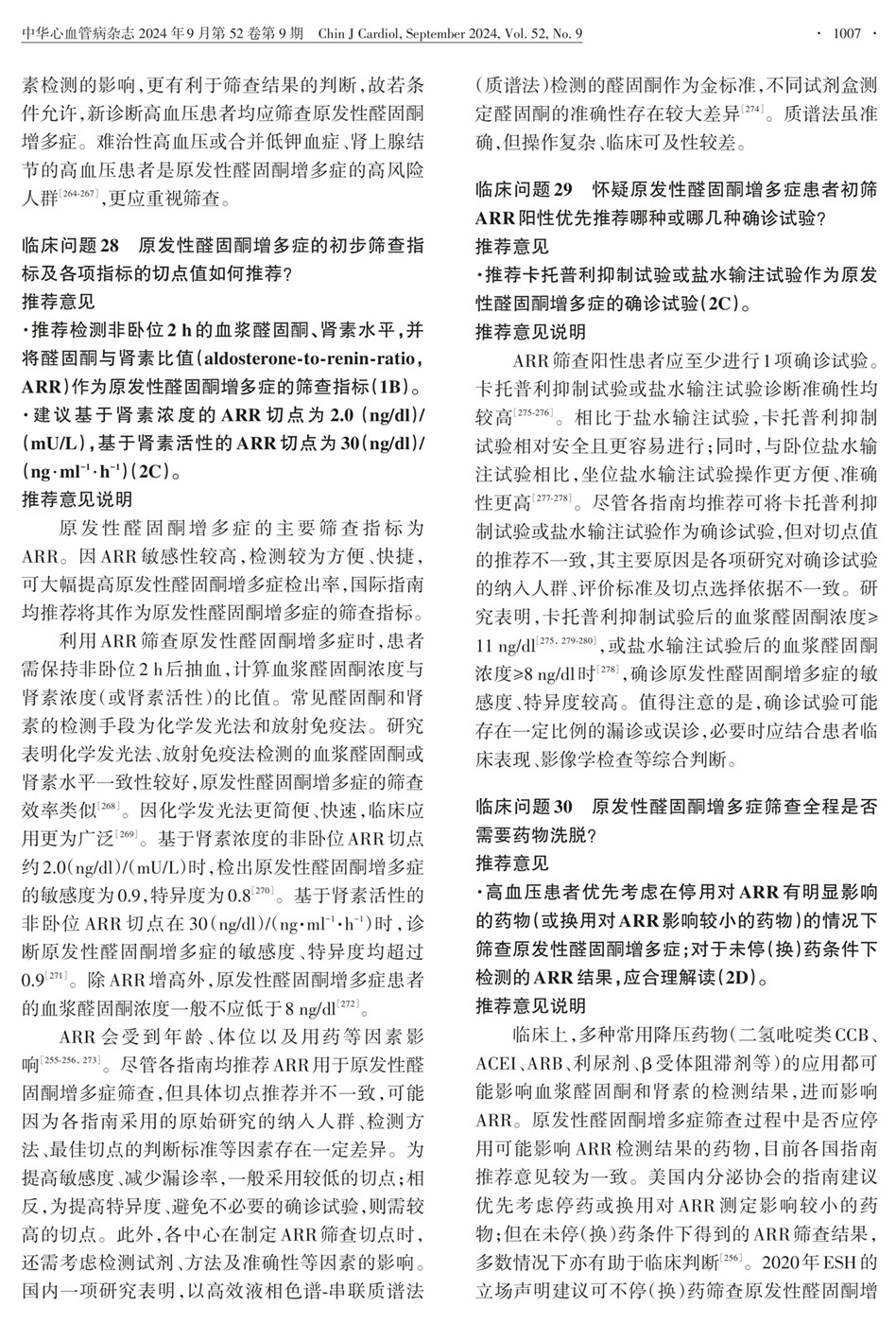 临床问题28-29:原发性醛固酮增多指标切点值、ARR阳性确认?临床问题30:是否需要药物洗脱?