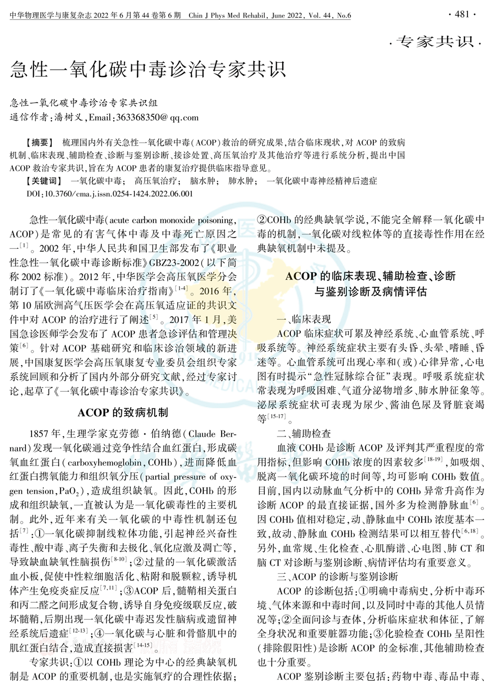 急性一氧化碳中毒诊治专家共识(2022年)