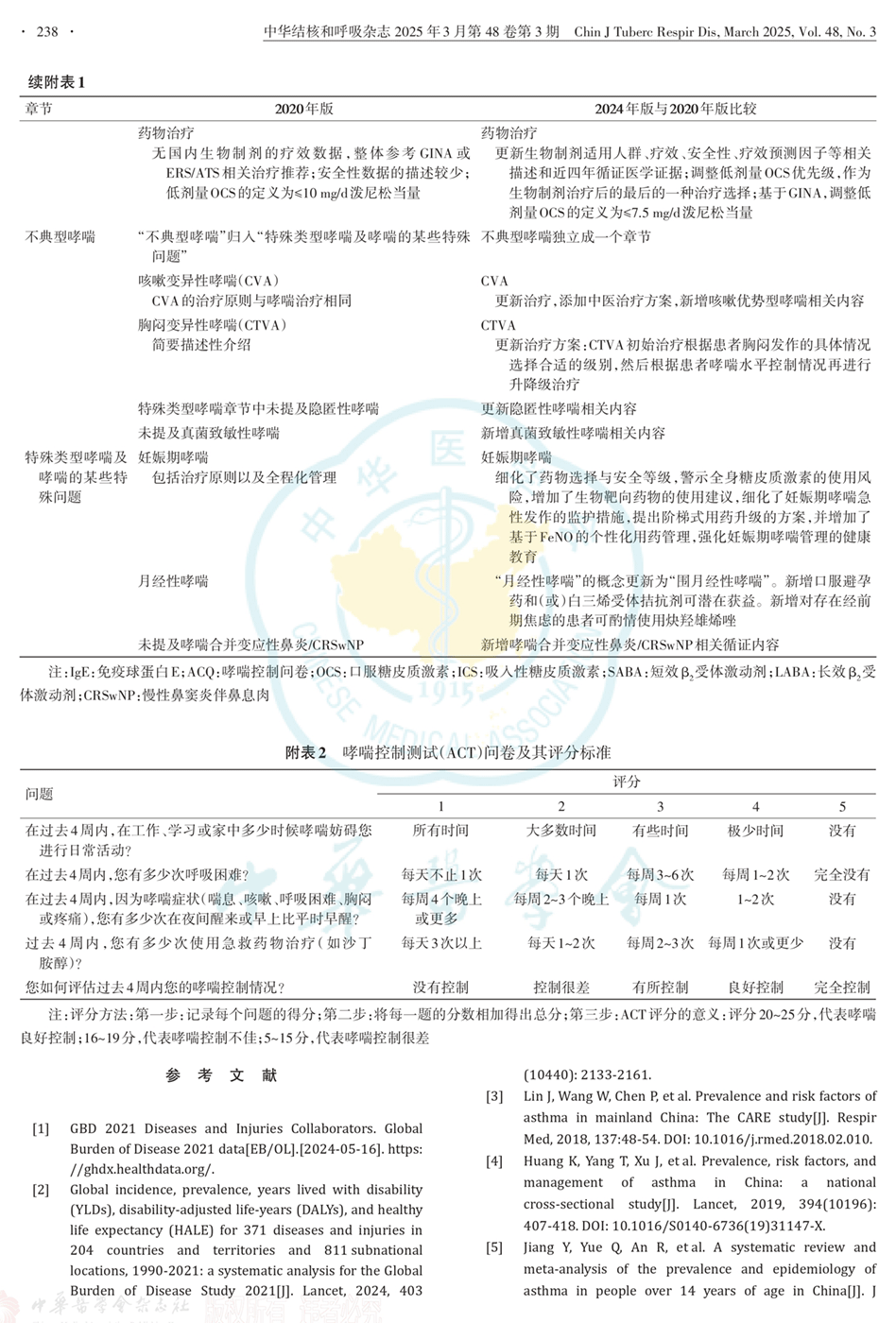 附表1 2024年版支气管哮喘防治指南较2023年版的更新要点