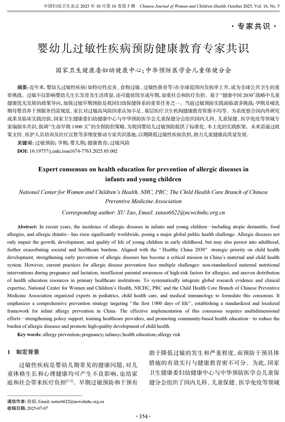 婴幼儿过敏性疾病预防健康教育专家共识(2025年)