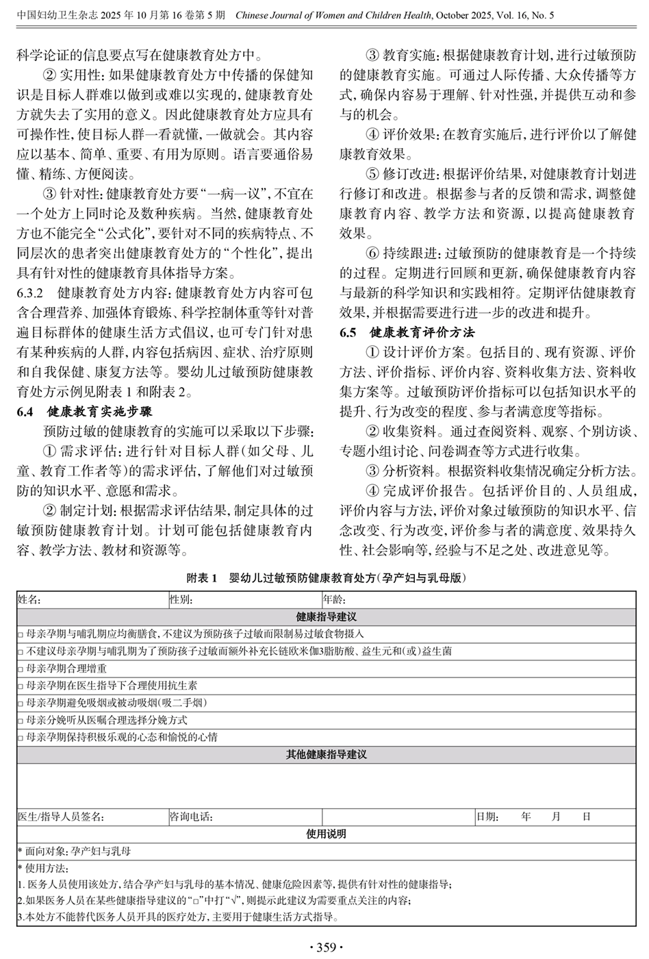 6、健康教育方法和评价 附表1 婴幼儿过敏预防健康教育处方