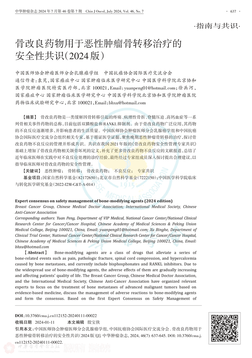 骨改良药物用于恶性肿瘤骨转移治疗的安全性共识(2024版)