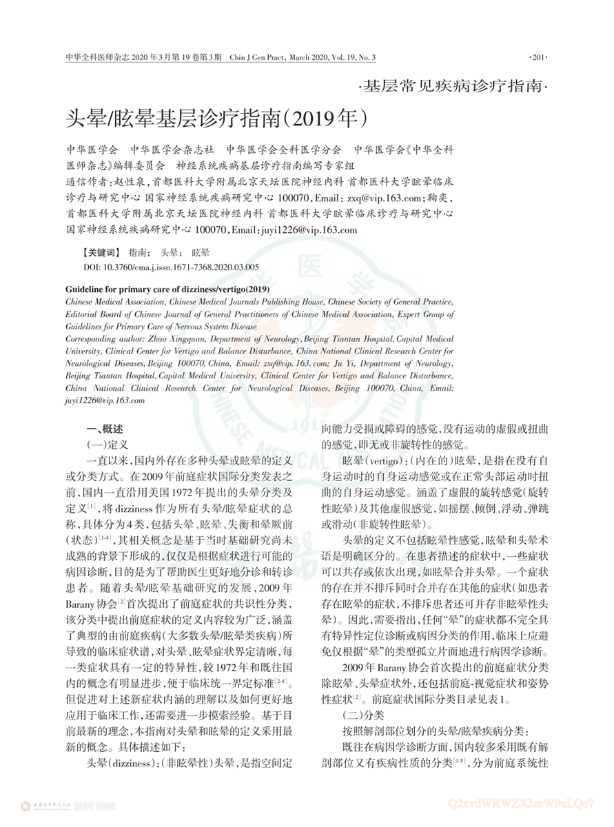 头晕/昡晕基层诊疗指南(2019年版)