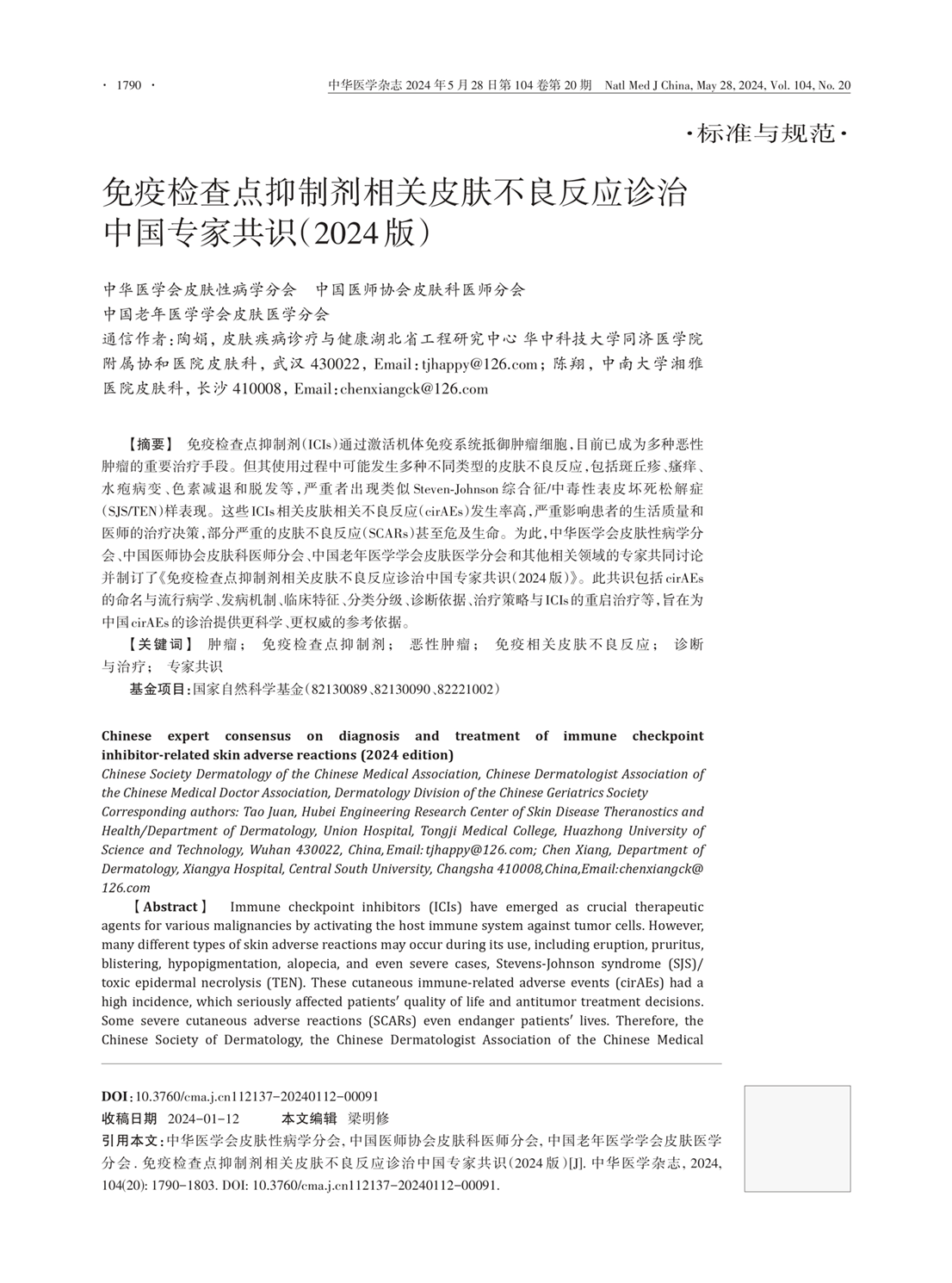 免疫检查点抑制剂相关皮肤不良反应诊治专家共识(2024版)