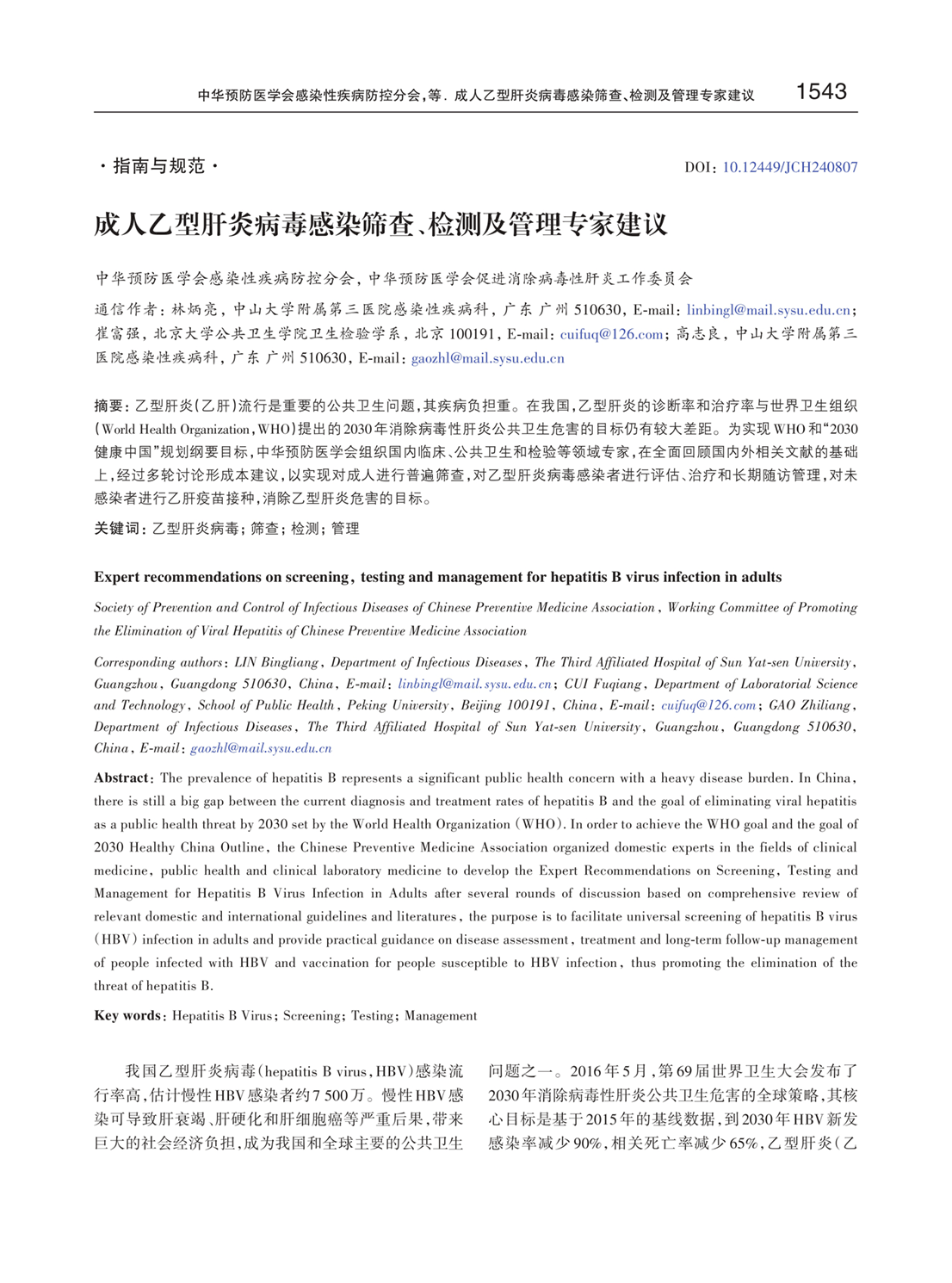 成人乙型肝炎病毒感染筛查、检测及管理专家建议(2024年)