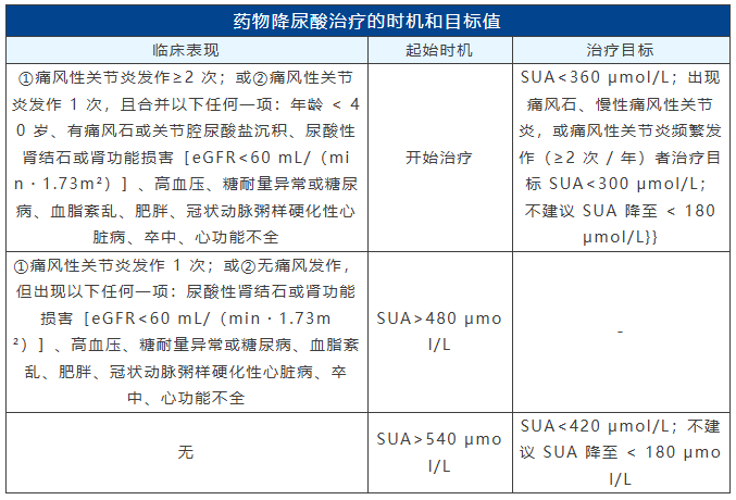 当非药物干预对HUA效果不佳时,可采用药物治疗。药物治疗方案应遵循个体化、分层、达标以及长程管理的原则,逐渐调整剂量,避免血尿酸水平在短期内出现较大波动,从而防止痛风急性发作。药物治疗的起始时机和治疗目标见下表。